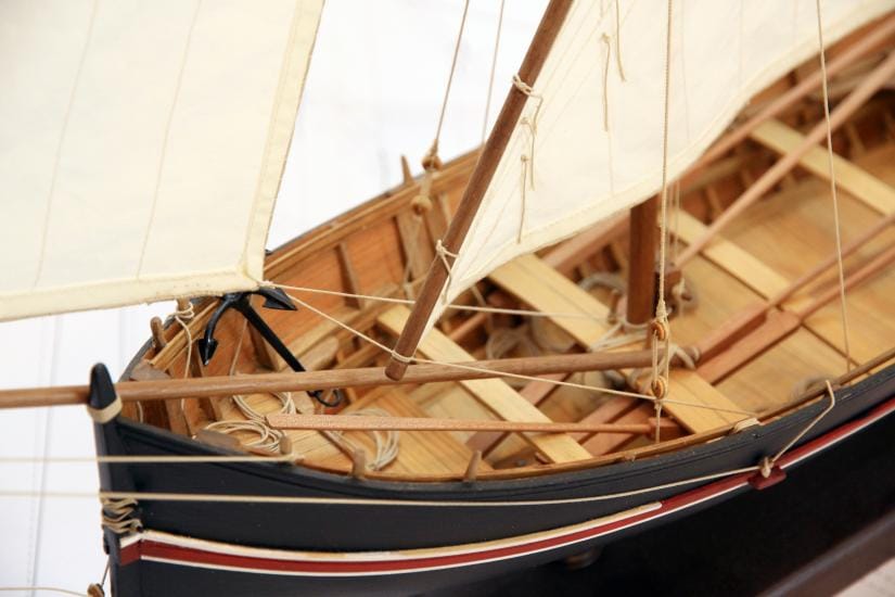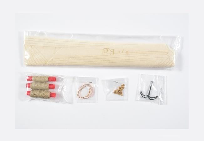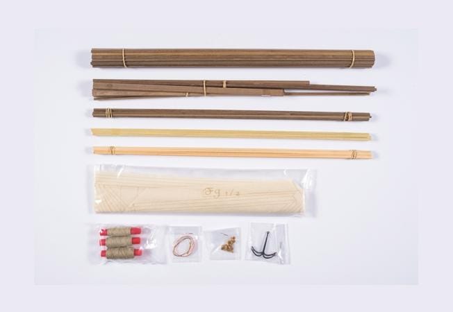This model kit is built with the highest precision. Every structural element—keel, posts, deck parts—is made of solid walnut wood, beautifully cut and ready for assembly.