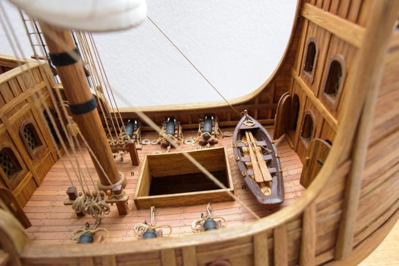 Unlike standard wooden ship model kits, this version includes fully detailed interiors, featuring: